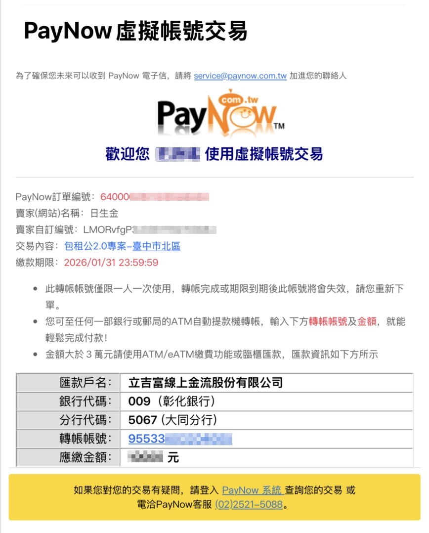 👇下單完成後,Paynow立吉富 第三方金流會寄相關匯款資訊Email到您的信箱👇
