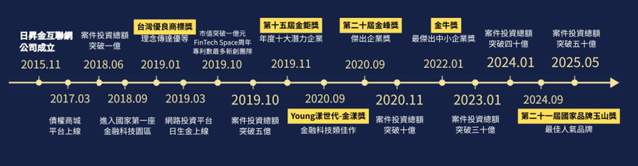 自成立以來,日生金始終秉持專業、穩健與透明的理念,致力打造安心可靠的投資環境。一路走來,我們不斷精進服務與平台品質,也在產業與社會各界的肯定中持續成長。以下圍日生金近年重要得獎紀錄與發展歷程,見證品牌一步一腳印的努力與成果。